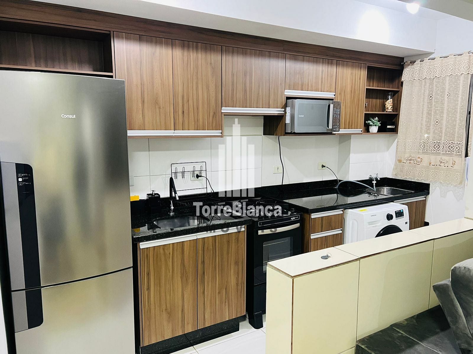 🔸 Cozinha equipada com armários planejados, geladeira, fogão e micro-ondas